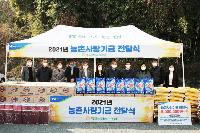 목포농협(박정수 조합장)은 우리 민족 최대의 명절인 설 명절을 앞두고 지난 3일 도움이 절실히 필요로 하는 이웃들에게 이웃사랑을 실천하고자 지역 내의 복지관, 요양원, 아동원 등 사회복지시설 12곳에 대해 500만원에 상당하는 쌀, 라면, 세제, 화장지 등 생활필수품을 지원하는‘농촌사랑기금’전달식을 가졌다.