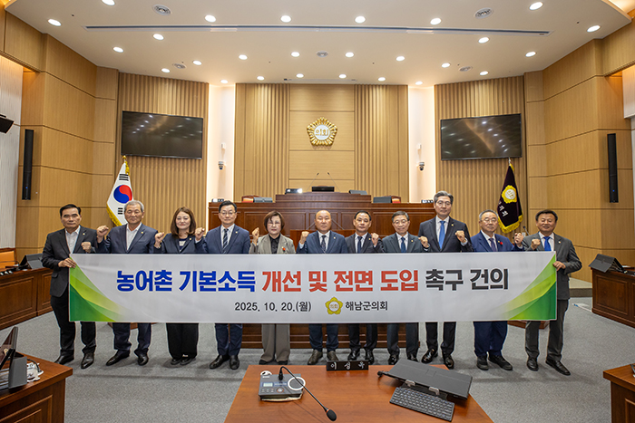 해남군의회가 농어촌 기본소득 제도의 실효성을 높이기 위해 정부에 재정 분담 비율 조정과 전국적 도입을 촉구했다. 군의회는 20일 「농어촌 기본소득 개선 및 전면 도입 촉구 건의문」을 발표하며 “현행 시범사업으로는 농촌 소멸을 막기 어렵다”며 정책 전환을 요구했다.