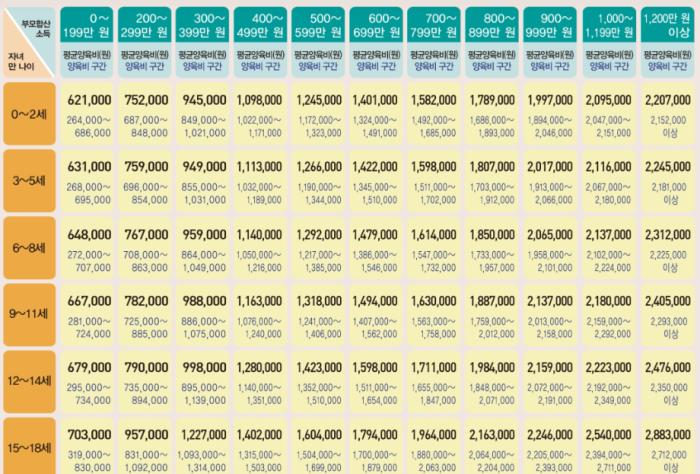 법원은 양육비 산정기준의 기본원칙(서울가정법원 『2021년 양육비 산정기준표 해설서』 2쪽)을 정한 가이드라인을 아래의 표와 같이 제공하고 있습니다.