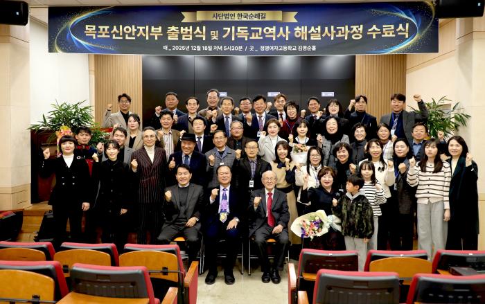 사단법인 한국순례길 목포신안지부 (지부장 승향아 목사) 출범식이 지난 12월 18일(목) 오후 5시 30분, 정명여자고등학교 김영순 홀에서 리셉션을 시작으로 은혜롭게 거행됐다. 이날 행사에서는 12주 과정의 기독교 역사·문화 해설사 양성과정을 마친 32명에 대한 수료식도 함께 진행돼 의미를 더했다.